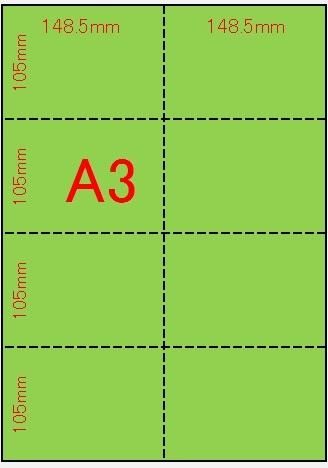 色上質紙A3サイズに、8分割(ヨコ3本タテ1本)ミシンを入れた商品です。